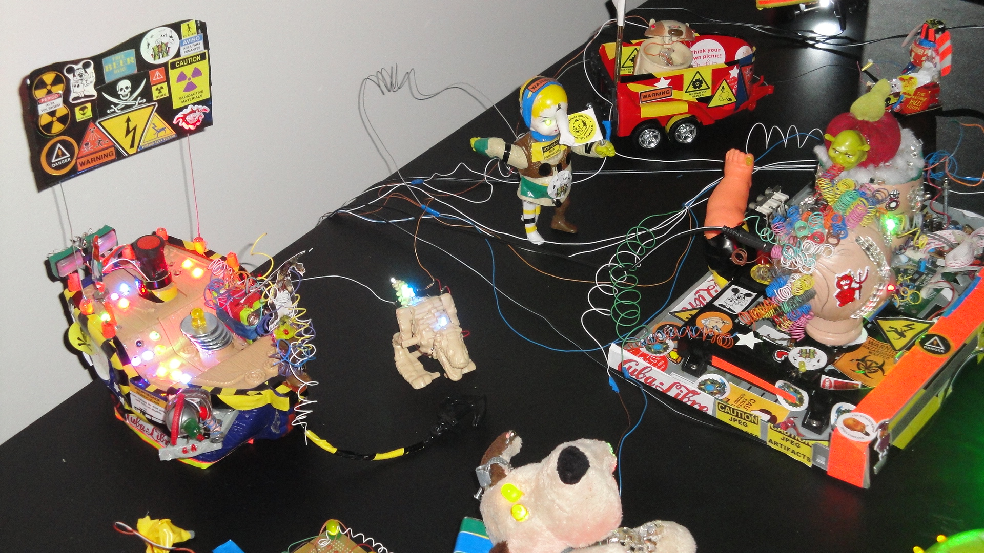 Cabeças feitas pelas alunas Nara, Tamires e Thais, da oficina Técnicas e Processos em Gambiologia I, no festival Continumm (vide posts anteriores). Estão afixadas em uma base que é a carcaça de um dvd estragado, contribuição da Tamires.