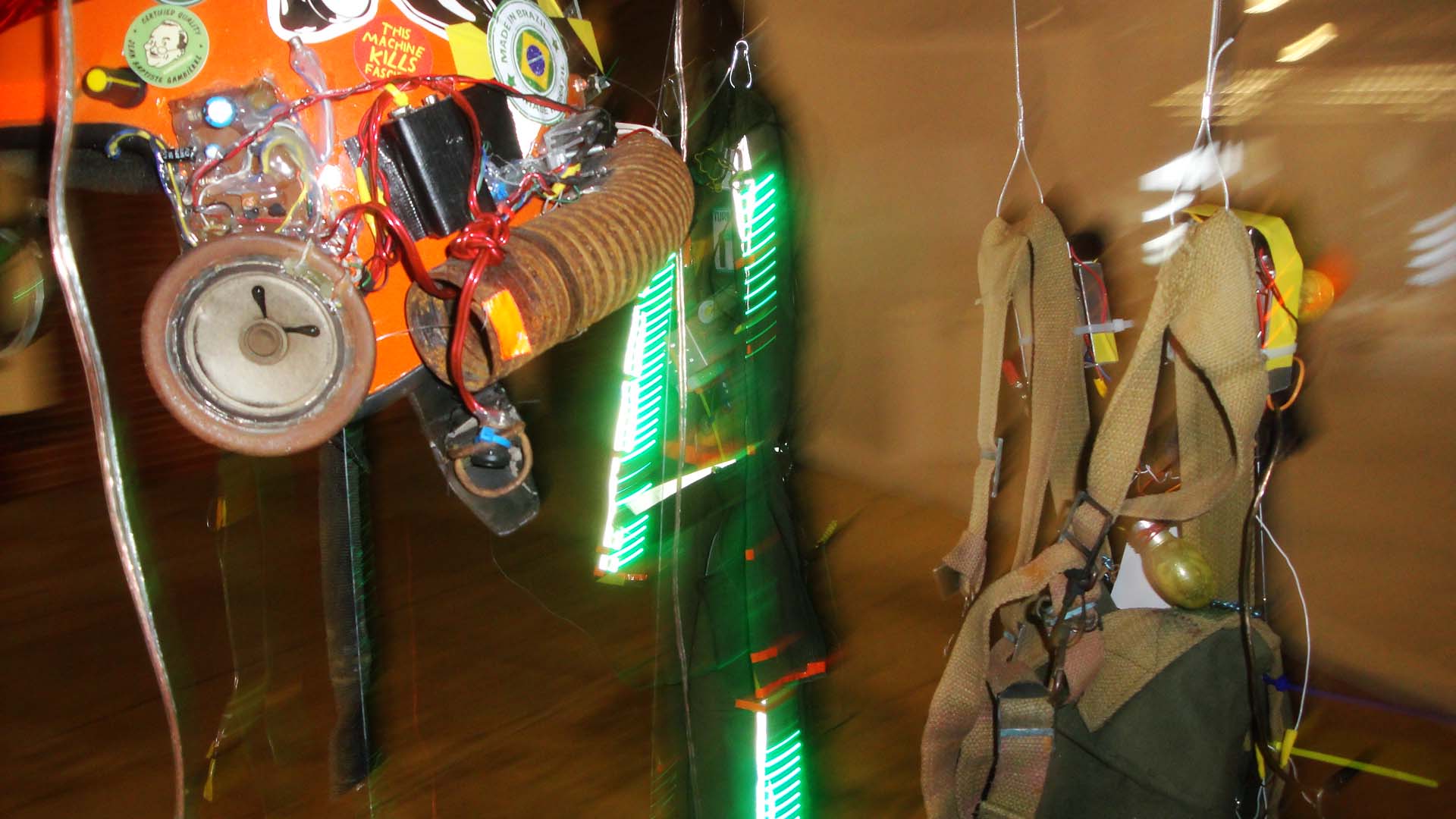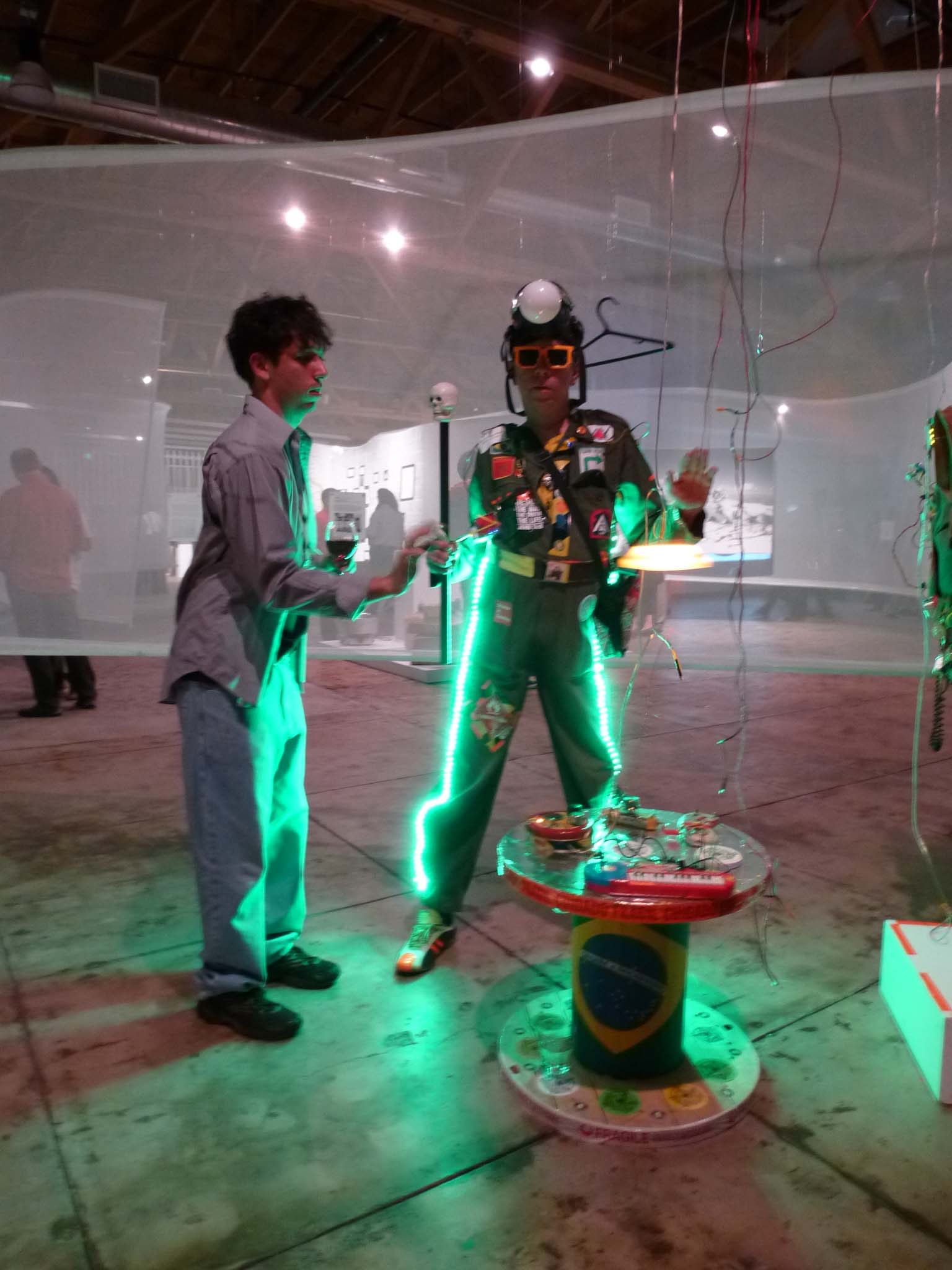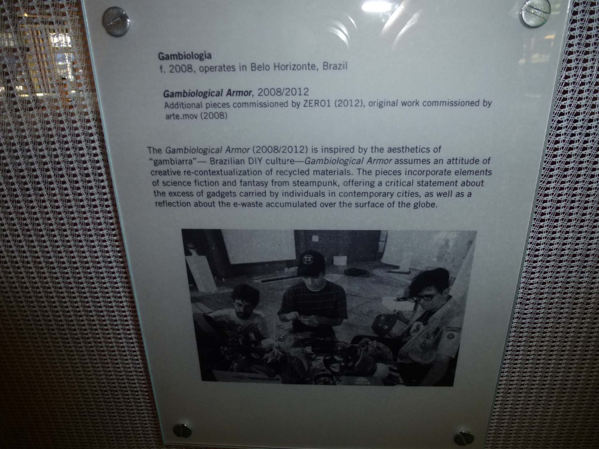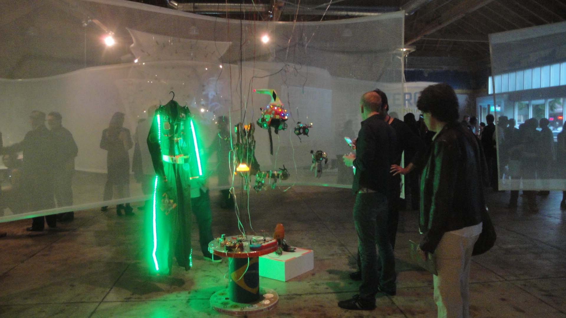 We are participating in the biennial with our Gambiological Armor and new interactive electronic sound devices: circuit bending keyboard, canned atari punk console, spatial ultra sonic hot glue gun and holy father joystick . Also present the Gambiological clothing flagged with the green high-brightness LEDs and reflective bands, among other peculiarities. Working with a 12 volt motorcycle battery, it was inaugurated with a performance by our Grand Master Goose, who circulated through the gallery also wearing an authentic Jury Rigged helmet and a Mickey Mouse Solution style mask, for the delight of those present. Thanks very much to everyone involved in the Zero1 Biennial, without exception.
