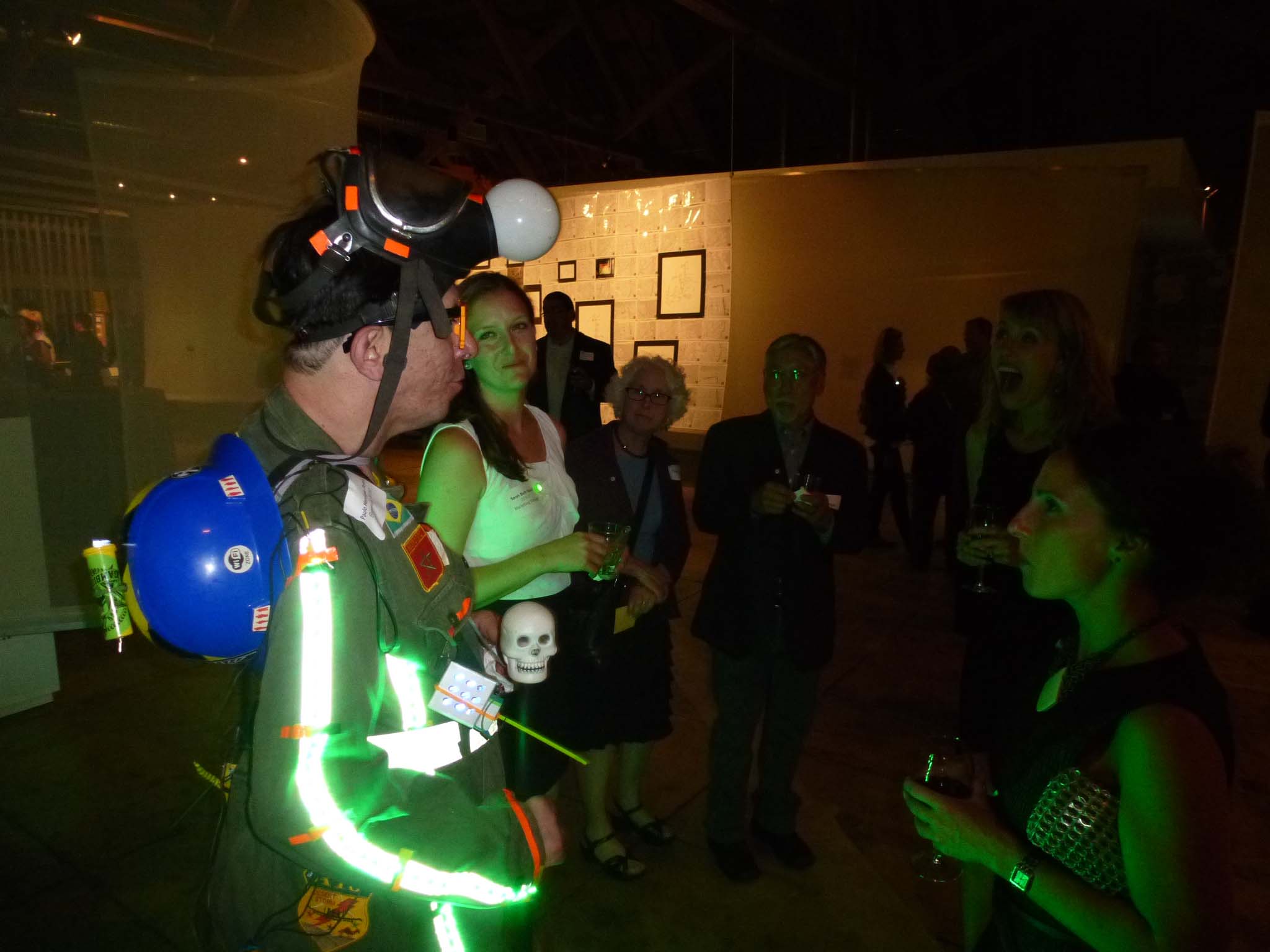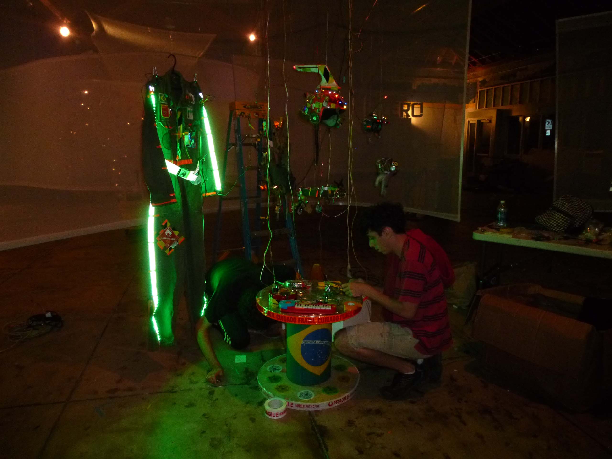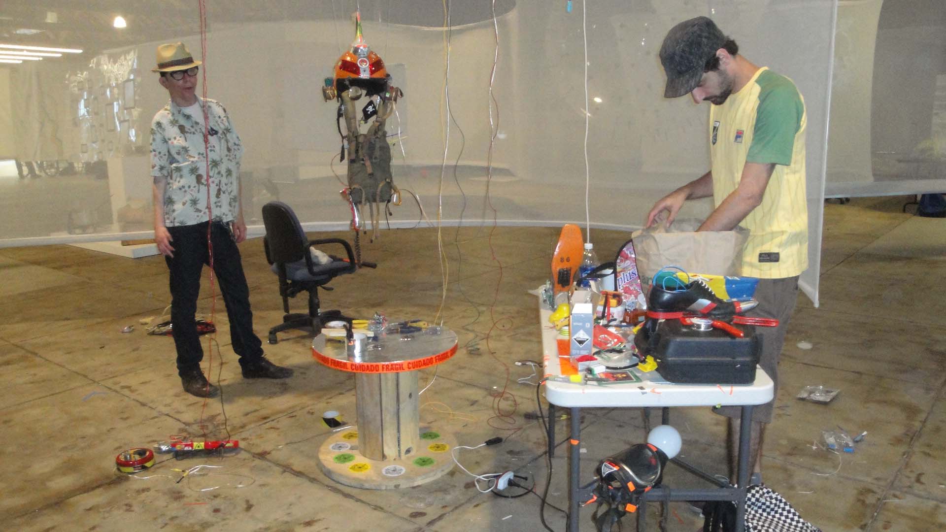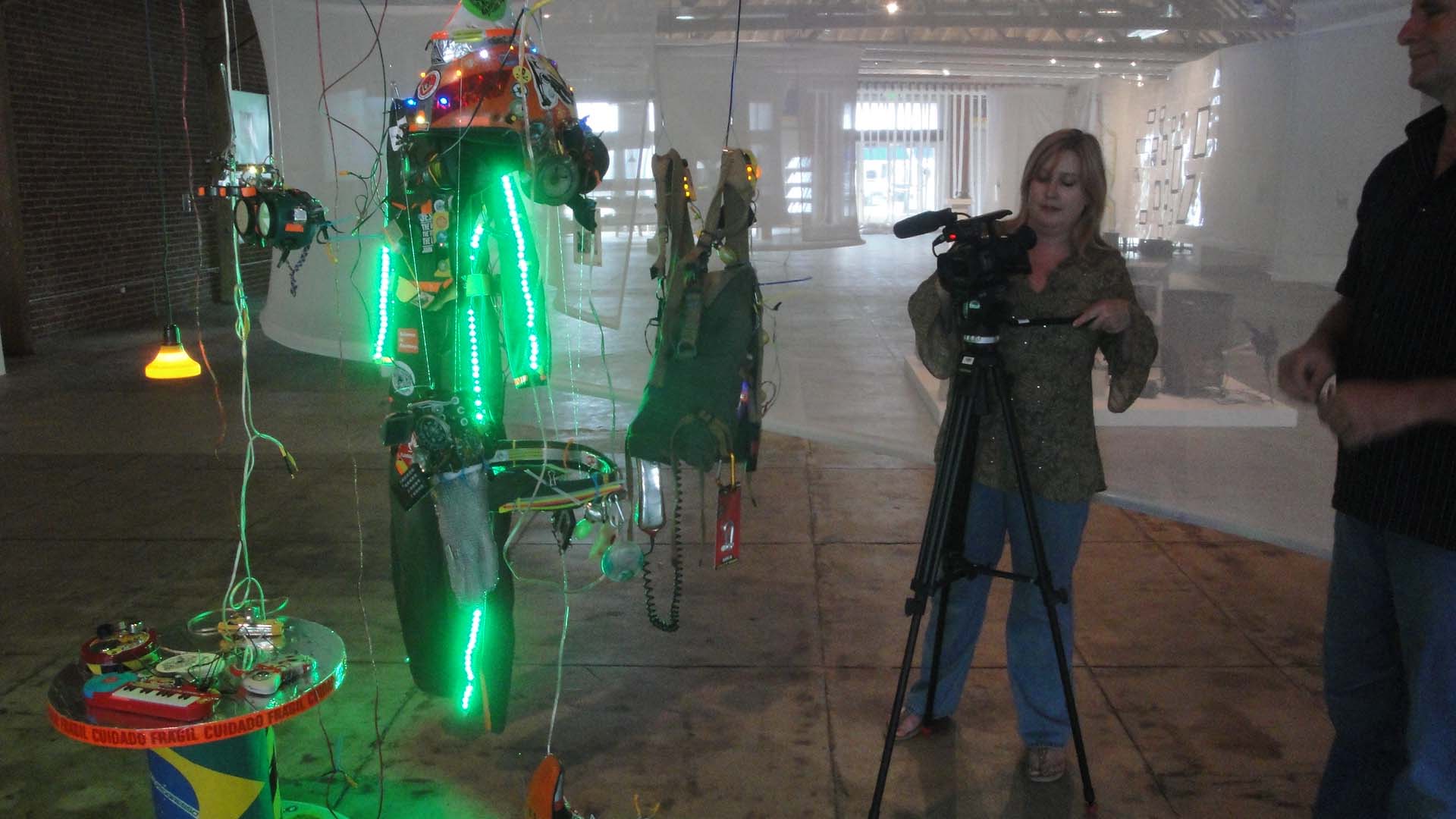 We are participating in the biennial with our Gambiological Armor and new interactive electronic sound devices: circuit bending keyboard, canned atari punk console, spatial ultra sonic hot glue gun and holy father joystick . Also present the Gambiological clothing flagged with the green high-brightness LEDs and reflective bands, among other peculiarities. Working with a 12 volt motorcycle battery, it was inaugurated with a performance by our Grand Master Goose, who circulated through the gallery also wearing an authentic Jury Rigged helmet and a Mickey Mouse Solution style mask, for the delight of those present. Thanks very much to everyone involved in the Zero1 Biennial, without exception.