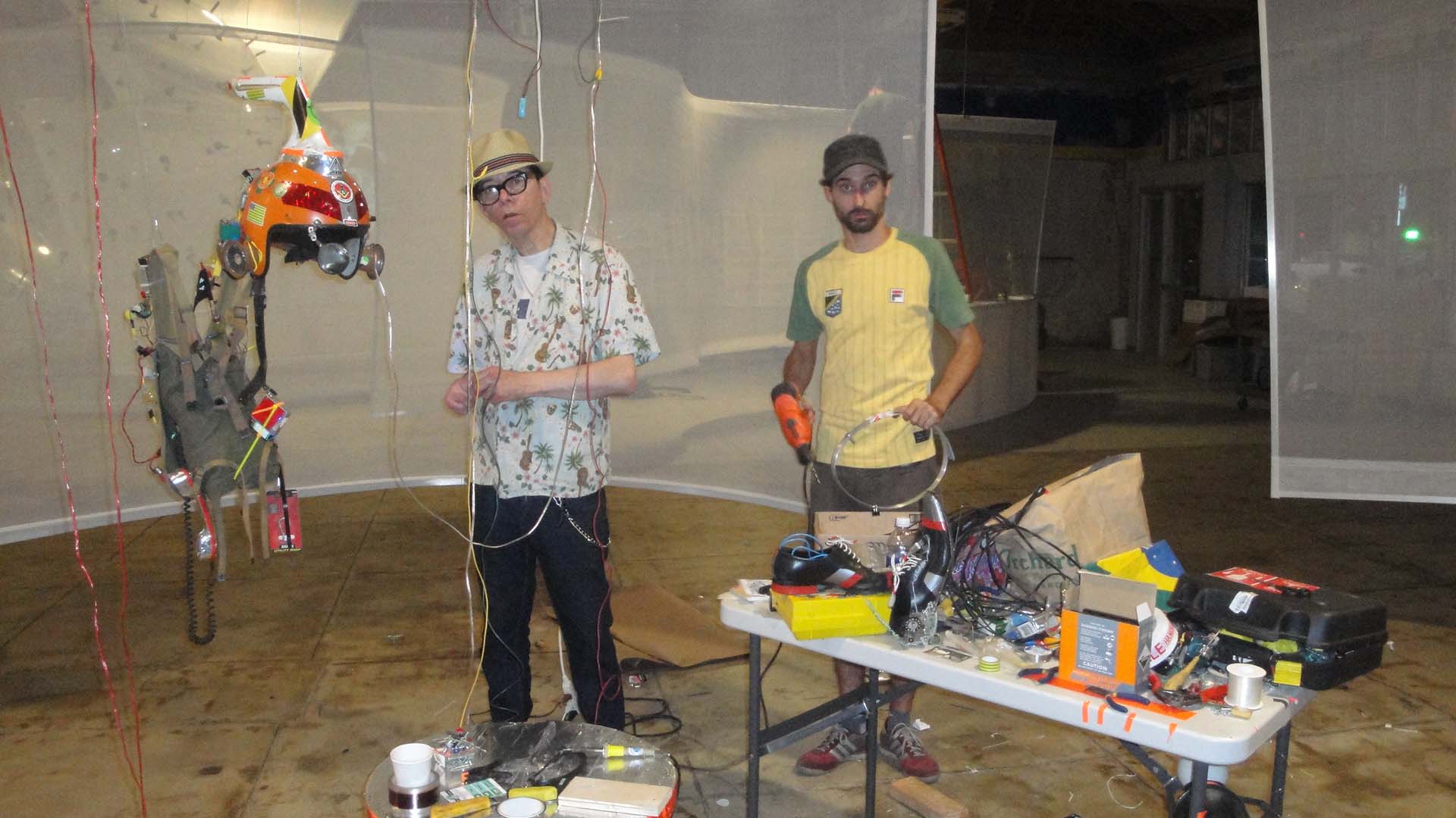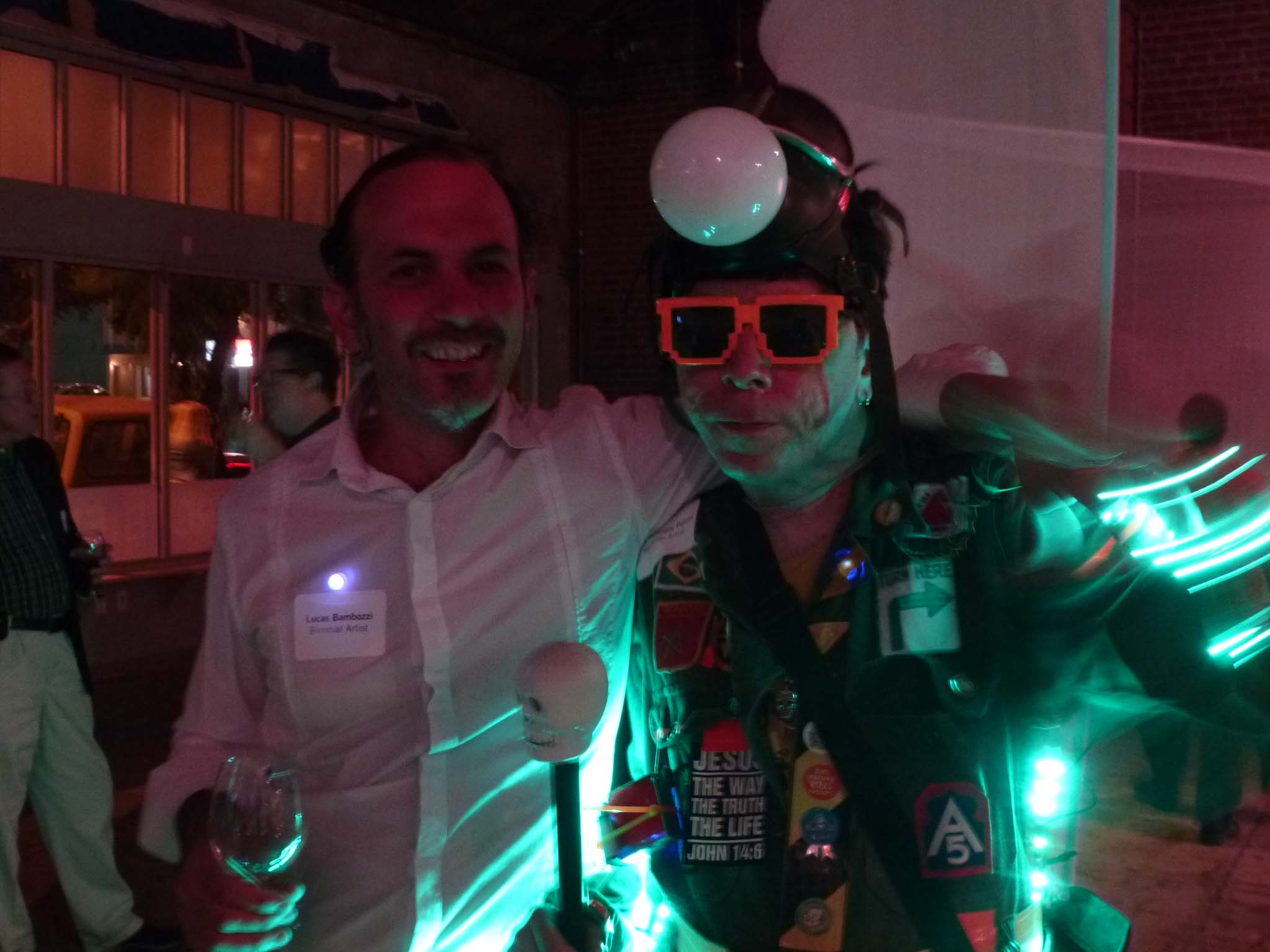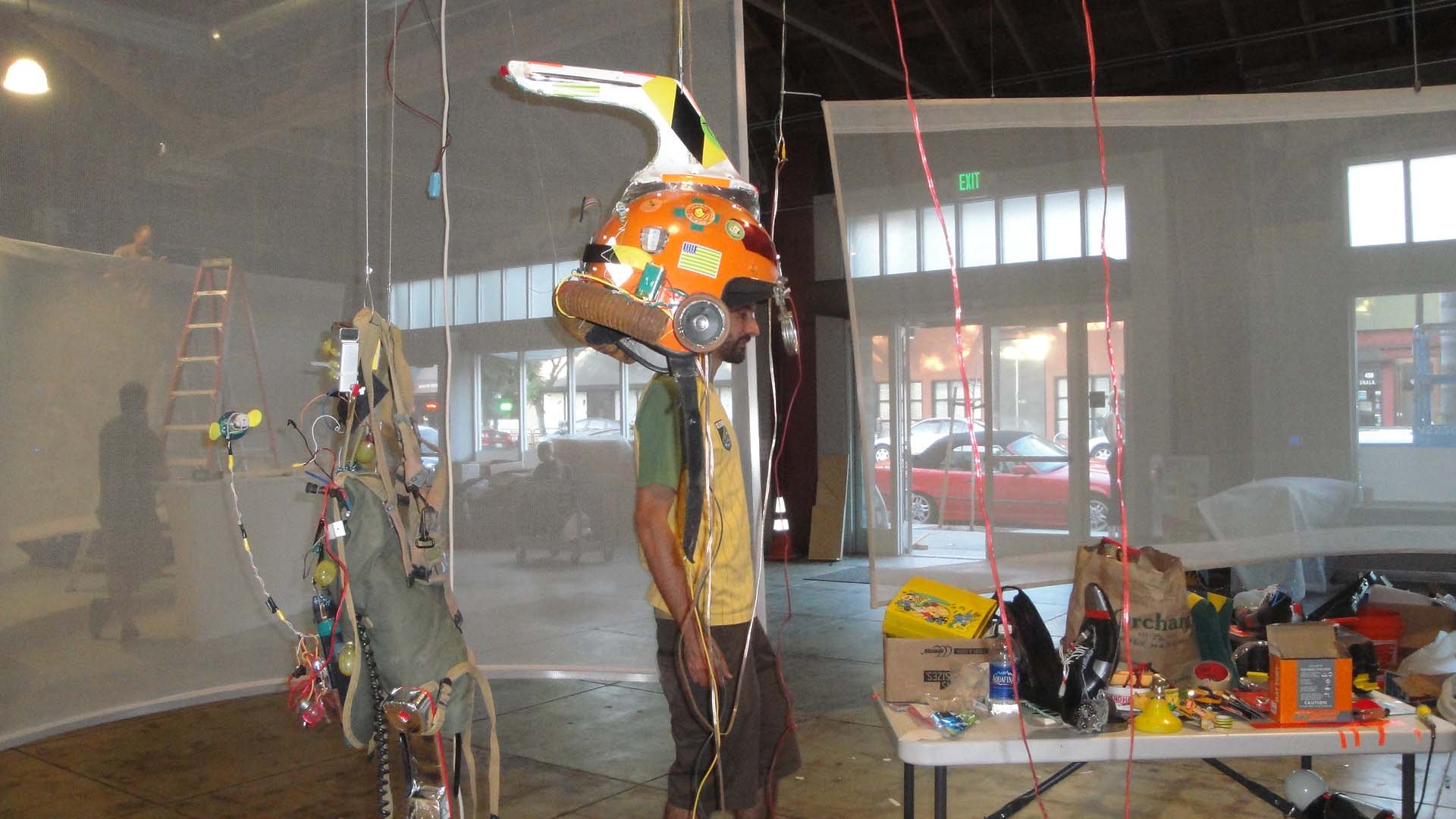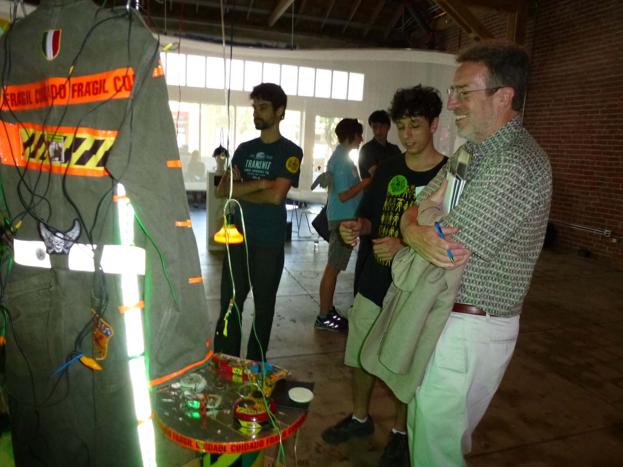 We are participating in the biennial with our Gambiological Armor and new interactive electronic sound devices: circuit bending keyboard, canned atari punk console, spatial ultra sonic hot glue gun and holy father joystick . Also present the Gambiological clothing flagged with the green high-brightness LEDs and reflective bands, among other peculiarities. Working with a 12 volt motorcycle battery, it was inaugurated with a performance by our Grand Master Goose, who circulated through the gallery also wearing an authentic Jury Rigged helmet and a Mickey Mouse Solution style mask, for the delight of those present. Thanks very much to everyone involved in the Zero1 Biennial, without exception.