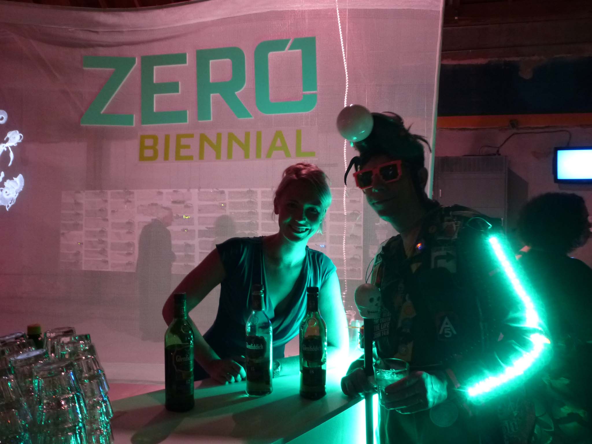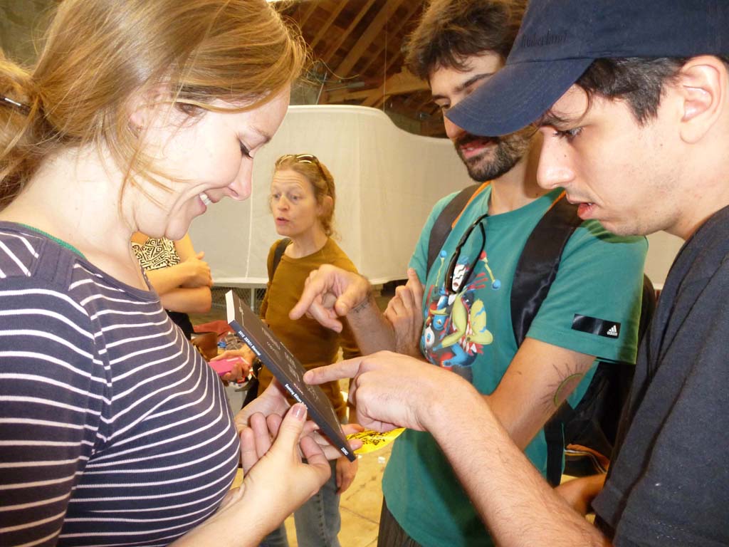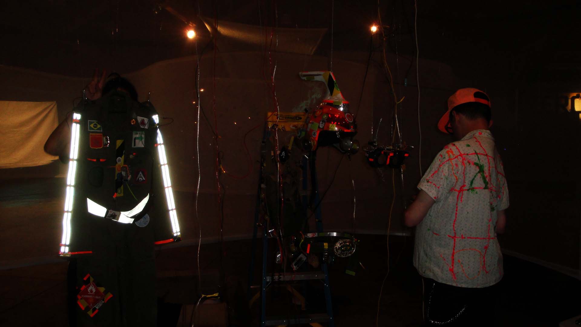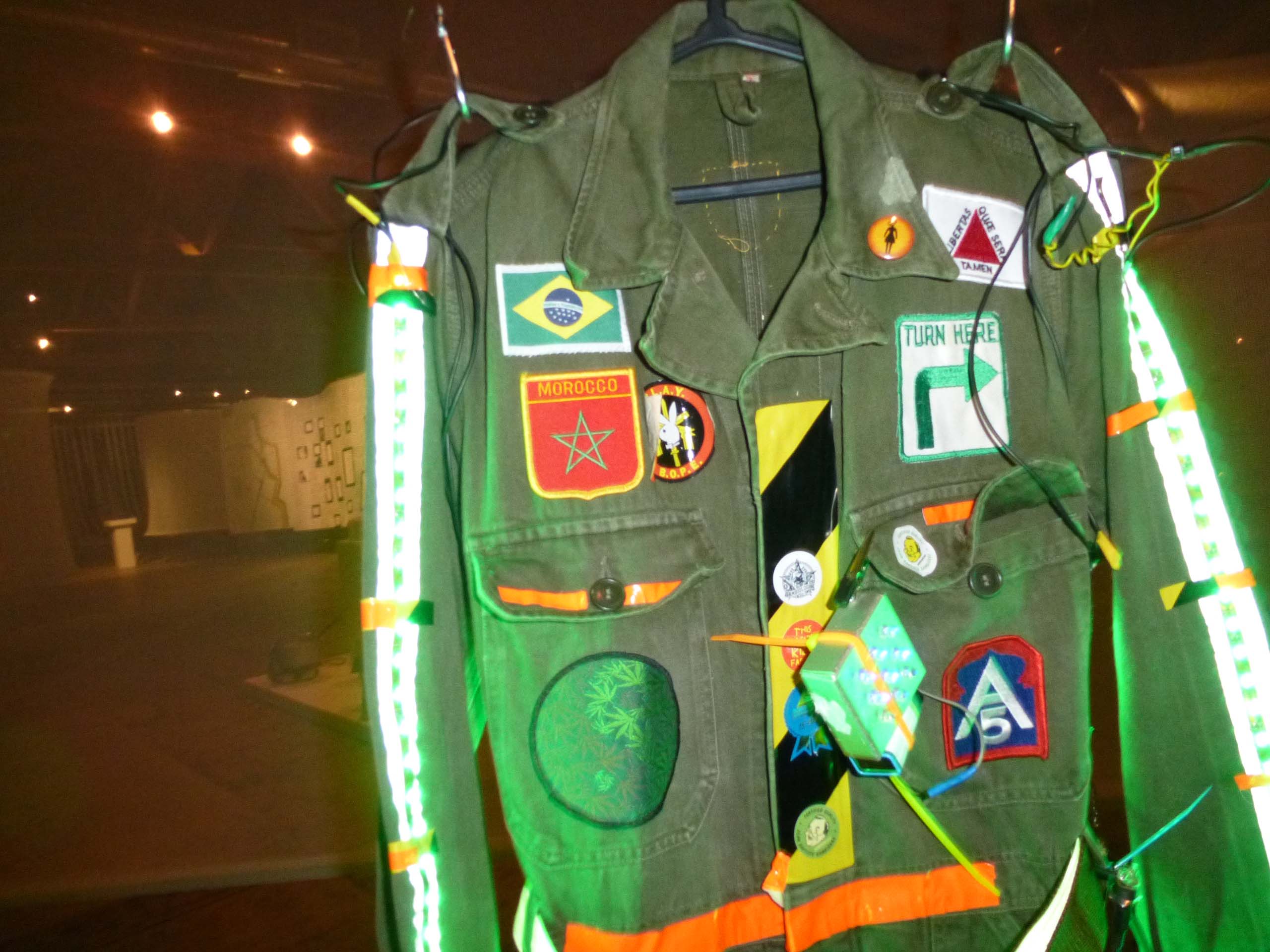 We are participating in the biennial with our Gambiological Armor and new interactive electronic sound devices: circuit bending keyboard, canned atari punk console, spatial ultra sonic hot glue gun and holy father joystick . Also present the Gambiological clothing flagged with the green high-brightness LEDs and reflective bands, among other peculiarities. Working with a 12 volt motorcycle battery, it was inaugurated with a performance by our Grand Master Goose, who circulated through the gallery also wearing an authentic Jury Rigged helmet and a Mickey Mouse Solution style mask, for the delight of those present. Thanks very much to everyone involved in the Zero1 Biennial, without exception.