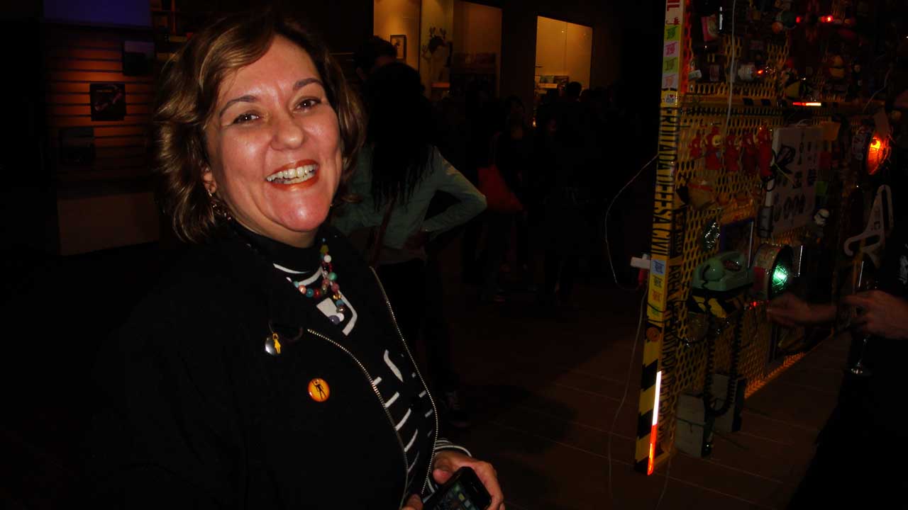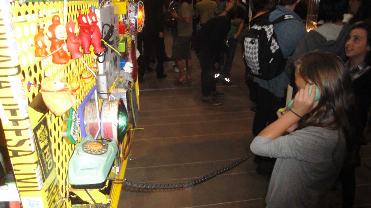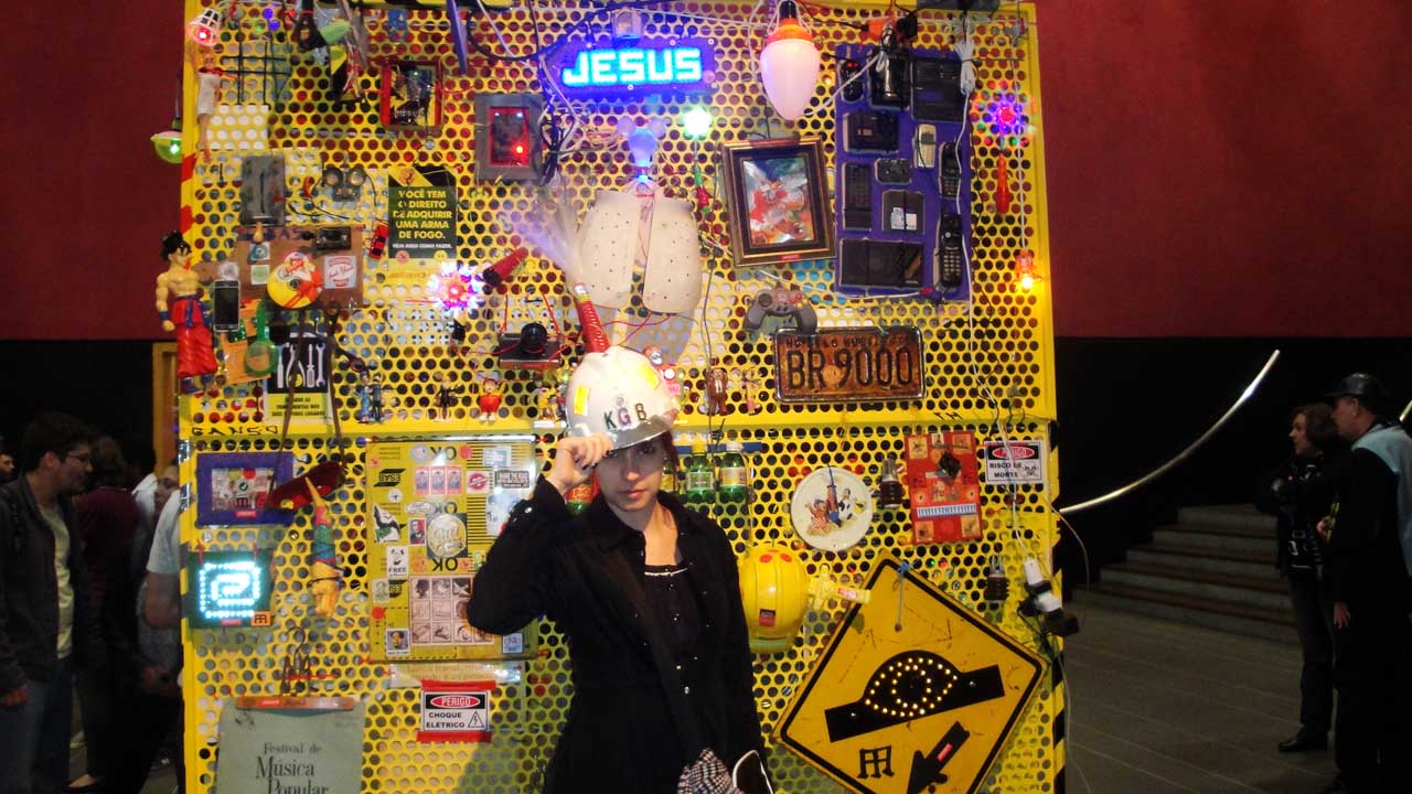 We are participating in the biennial with our Gambiological Armor and new interactive electronic sound devices: circuit bending keyboard, canned atari punk console, spatial ultra sonic hot glue gun and holy father joystick . Also present the Gambiological clothing flagged with the green high-brightness LEDs and reflective bands, among other peculiarities. Working with a 12 volt motorcycle battery, it was inaugurated with a performance by our Grand Master Goose, who circulated through the gallery also wearing an authentic Jury Rigged helmet and a Mickey Mouse Solution style mask, for the delight of those present. Thanks very much to everyone involved in the Zero1 Biennial, without exception.
