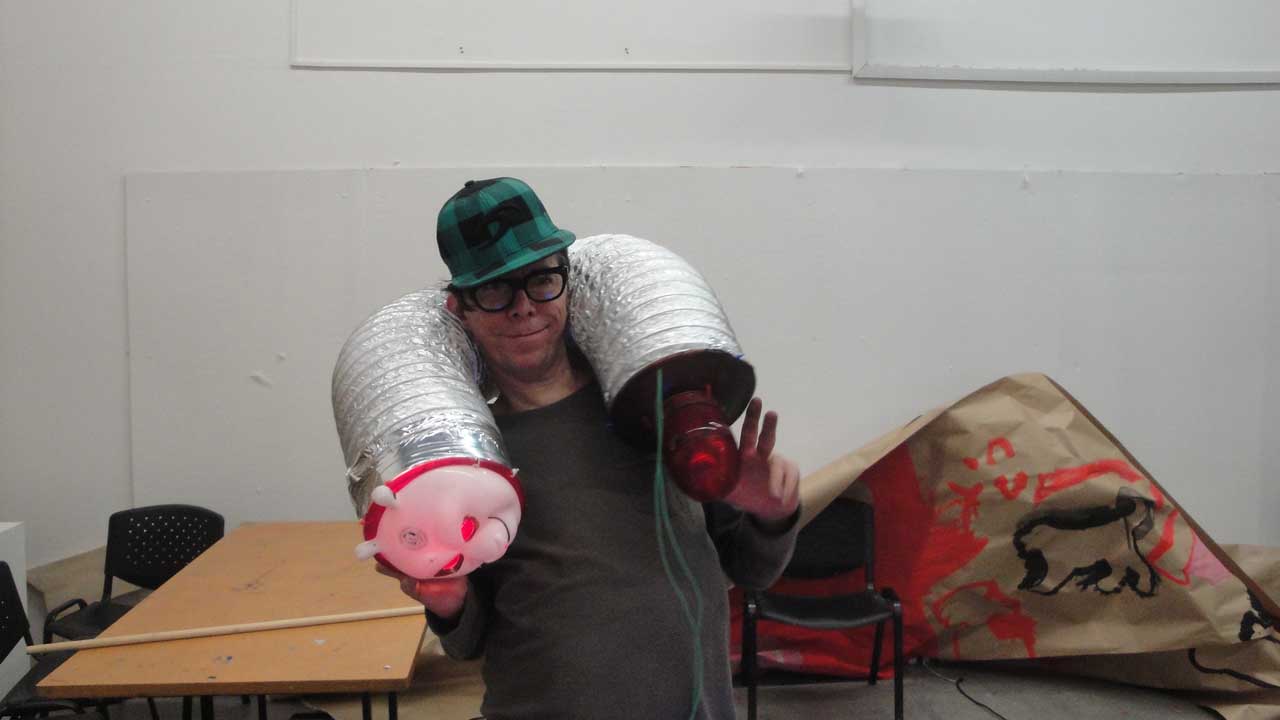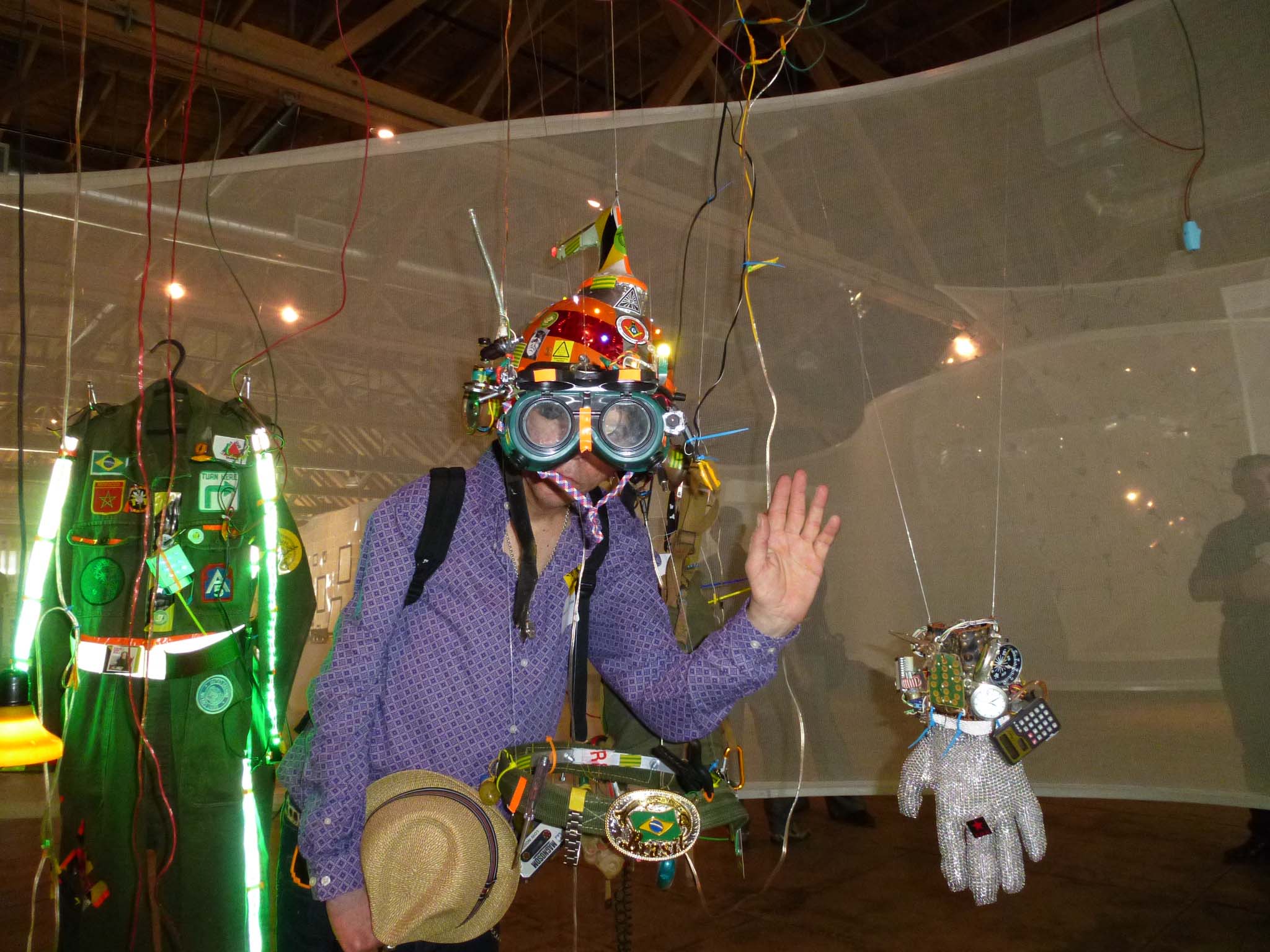 We are participating in the biennial with our Gambiological Armor and new interactive electronic sound devices: circuit bending keyboard, canned atari punk console, spatial ultra sonic hot glue gun and holy father joystick . Also present the Gambiological clothing flagged with the green high-brightness LEDs and reflective bands, among other peculiarities. Working with a 12 volt motorcycle battery, it was inaugurated with a performance by our Grand Master Goose, who circulated through the gallery also wearing an authentic Jury Rigged helmet and a Mickey Mouse Solution style mask, for the delight of those present. Thanks very much to everyone involved in the Zero1 Biennial, without exception.